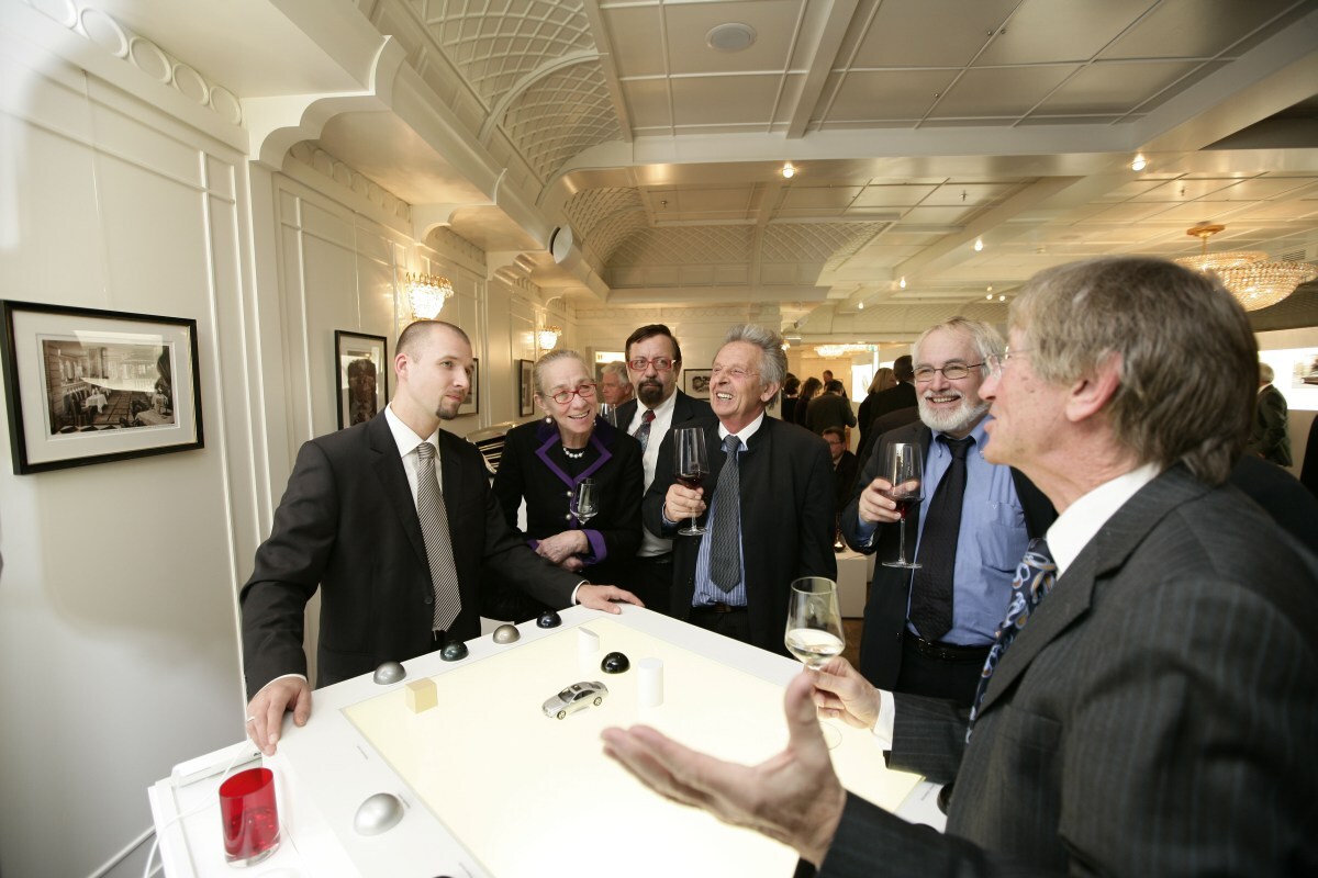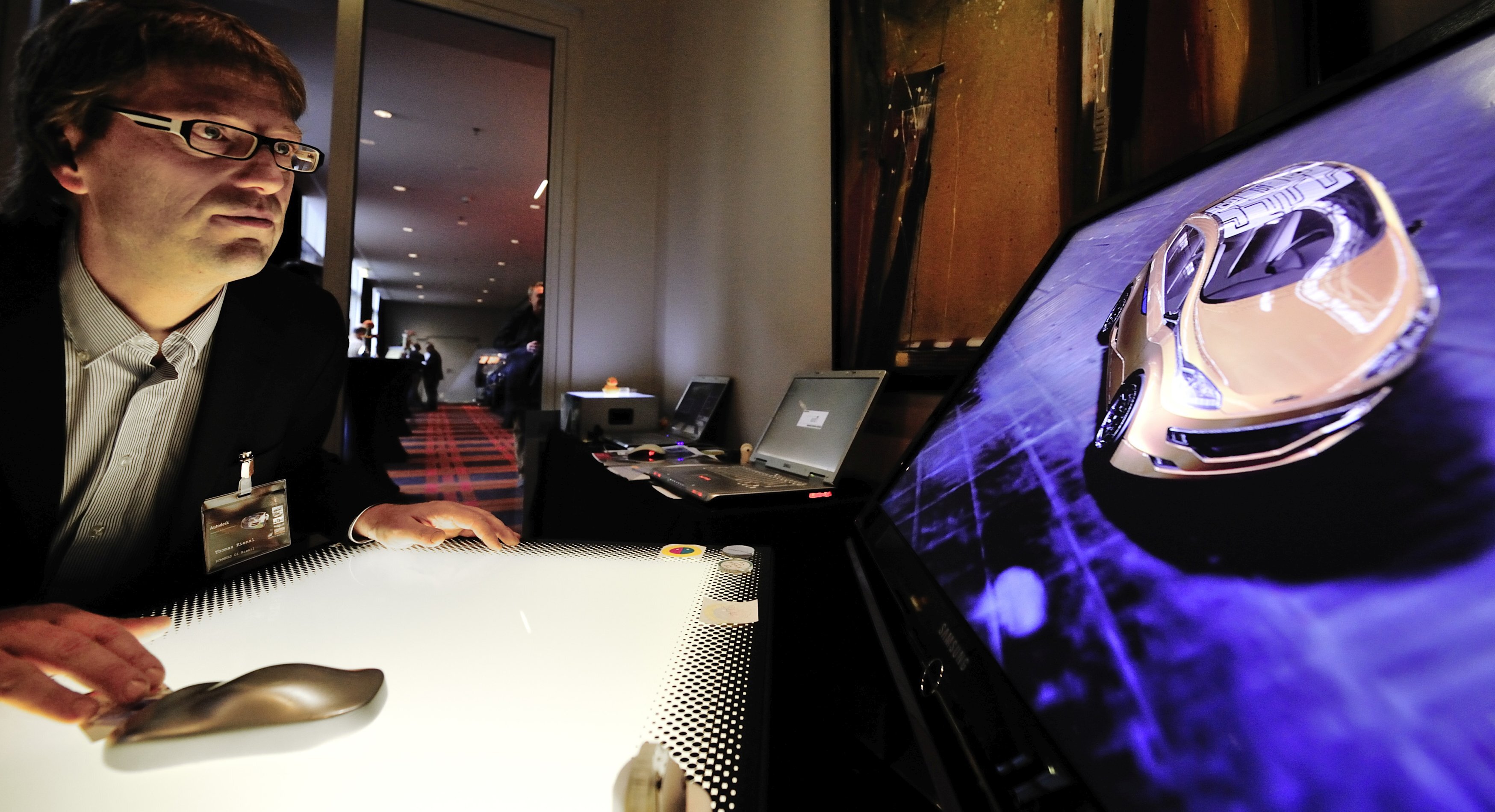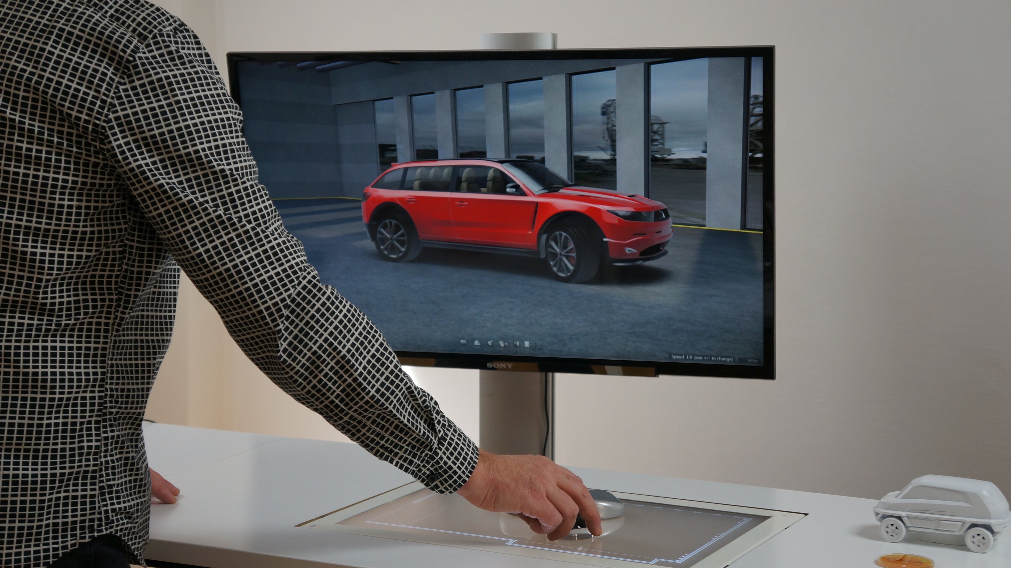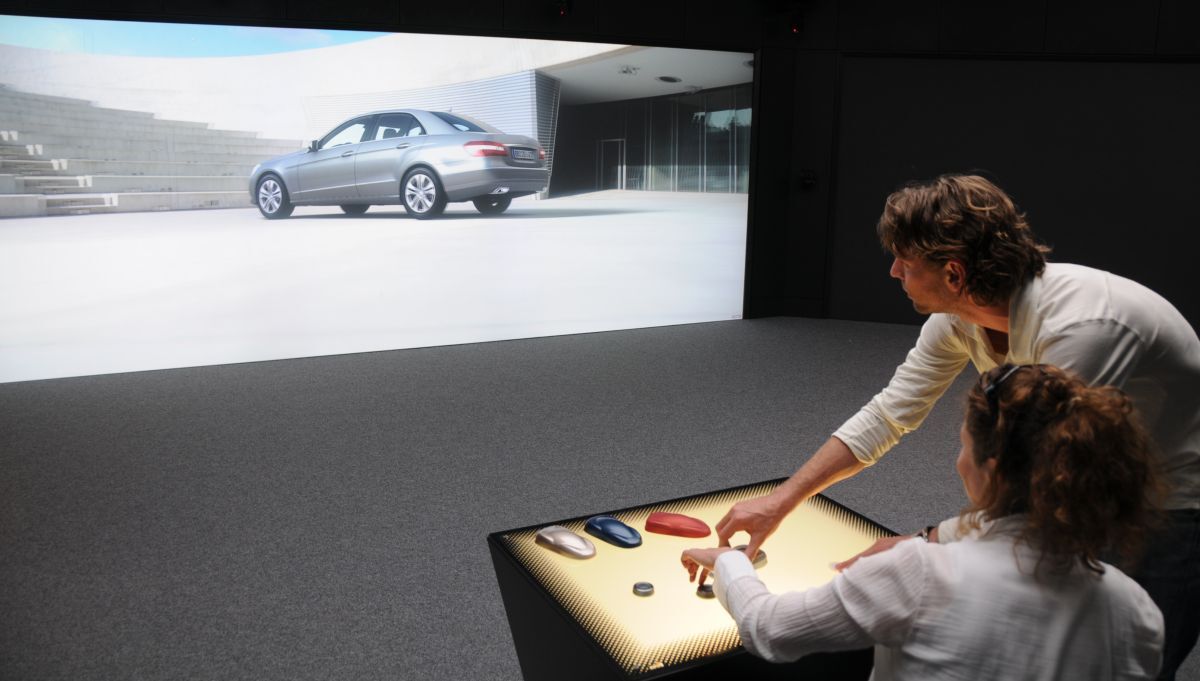 Daimler is using edddison that allows the management to view, understand and decide the newest car design. The design department of Daimler in Sindelfingen uses the interactive technology for internal meetings, when they are presenting new vehicle concepts to the managing board. The edddison table, on which a small vehicle-model, figures and sample cards are arranged, is located in front of a Powerwall, on which a fully developed, true in detail vehicle-draft 1:1 is displayed. The management board can take matters into their own hands: By moving the figures and the vehicle-model on the table they can roundly examine the visualized vehicle on the Powerwall. With the prepared sample-cards design and equipment options can be tried and visualized in a twinkling of an eye. Thus the decision-making process is considerably accelerated.