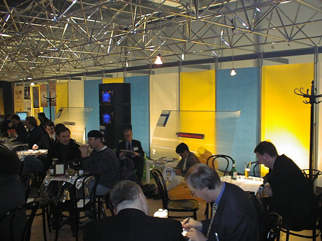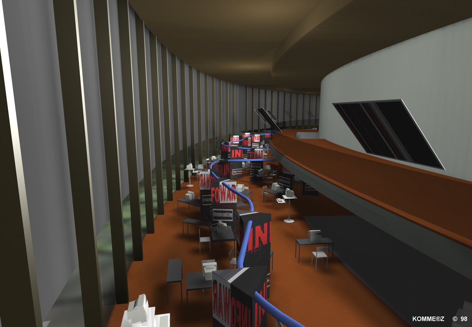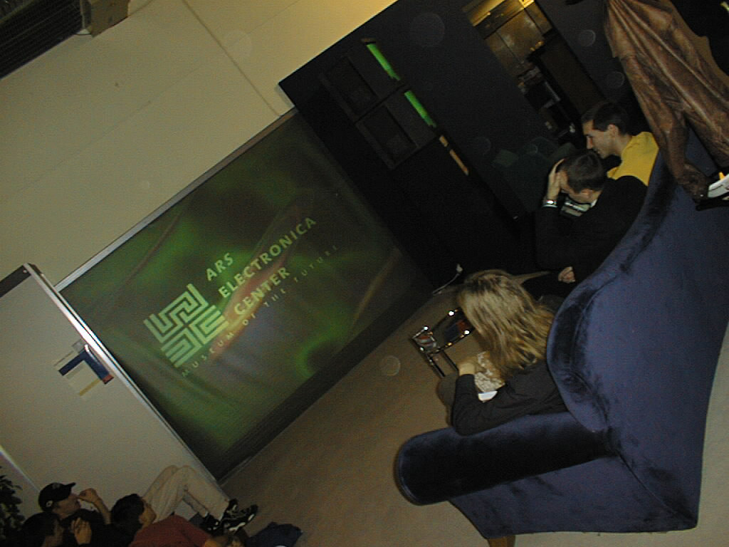 The Ars Electronica Center's contribution to IST 98 (information society technologies) was the realization of the Cyber Café "B4 Blue Box Coffee House" with live feed from the Blue Box Bar, with surf stations and projection screen. A web cam fed images live from the Austria Center Vienna to the internet.