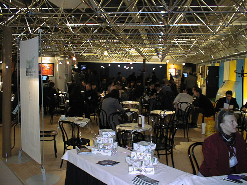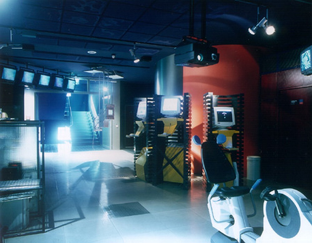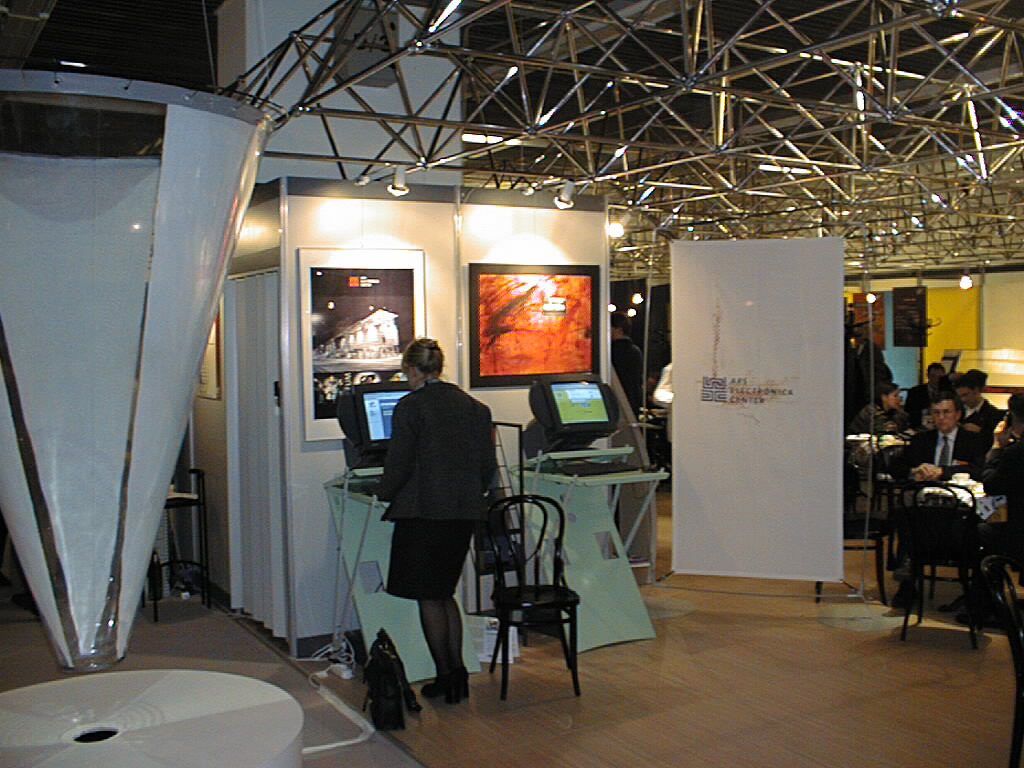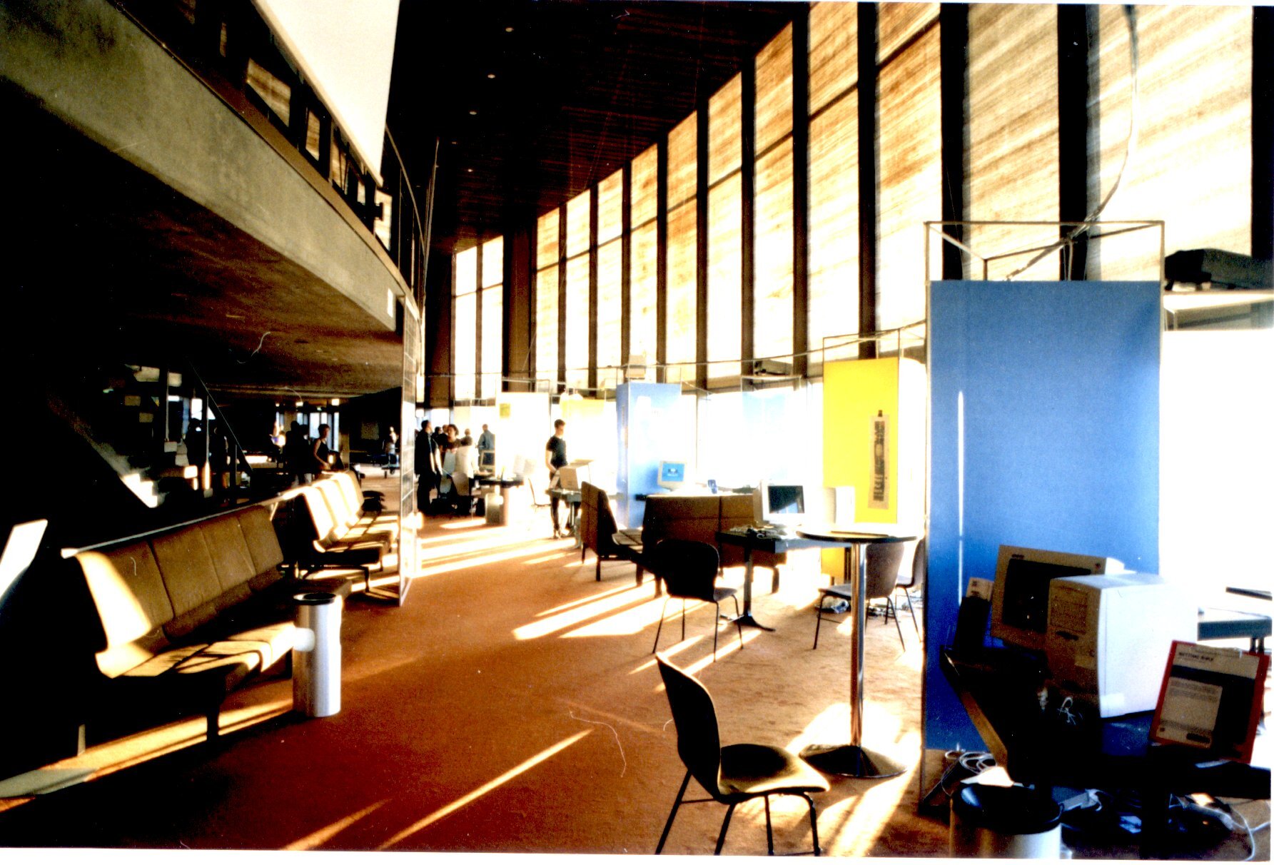 The Ars Electronica Center's contribution to IST 98 (information society technologies) was the realization of the Cyber Café "B4 Blue Box Coffee House" with live feed from the Blue Box Bar, with surf stations and projection screen. A web cam fed images live from the Austria Center Vienna to the internet.