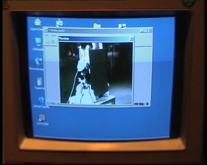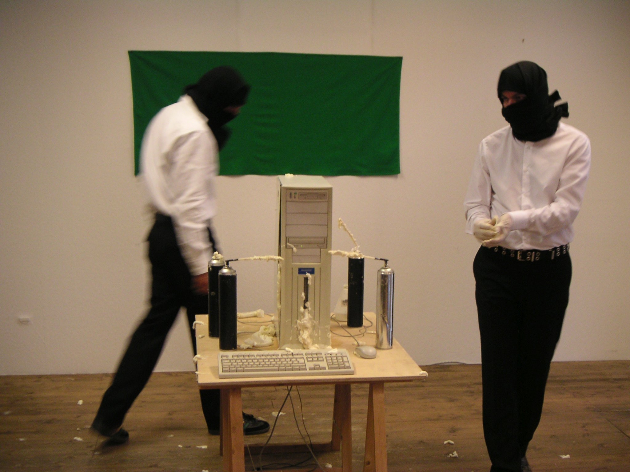 A computer is filmed from the inside and outside with two webcams; the images are transmitted to the Internet. From a website, the computer to be foamed out gets pictures of its own destruction and shows them while it is still functional." So much for the "experimental arrangement" by Thomas Kienzl. Analogous to the 2003 reinterpretation of Rudolf Schwarzkogler's action "musikalische komödie für 's fernsehen (farbfernsehen)", G.R.A.M. reinterprets Thomas Kienzl's piece. The destruction of a computer by PU-foam is connected by G.R.A.M. with the -via Internet- published videos about hostage-takings by Islamist religious warriors. The action takes place in virtual, public space: a man-machine staging as an endless loop; a triangular relationship between perpetrator, victim and consumer. This is the only way modern terror works.