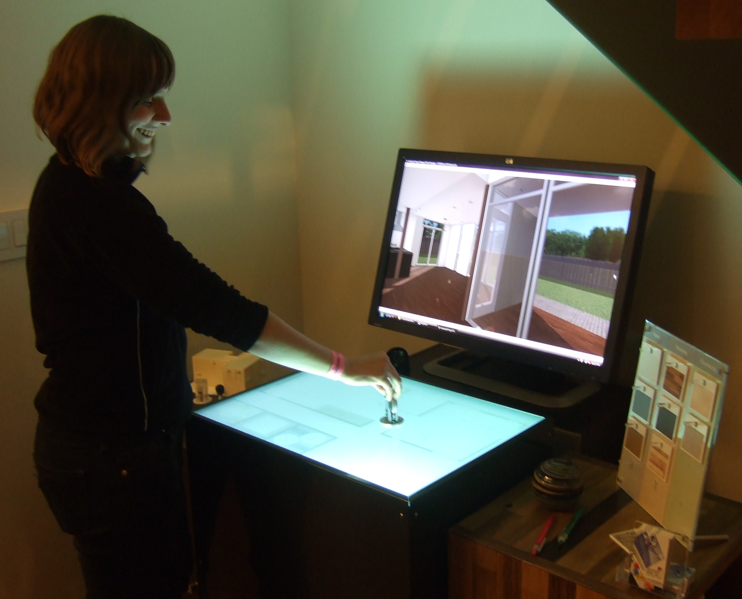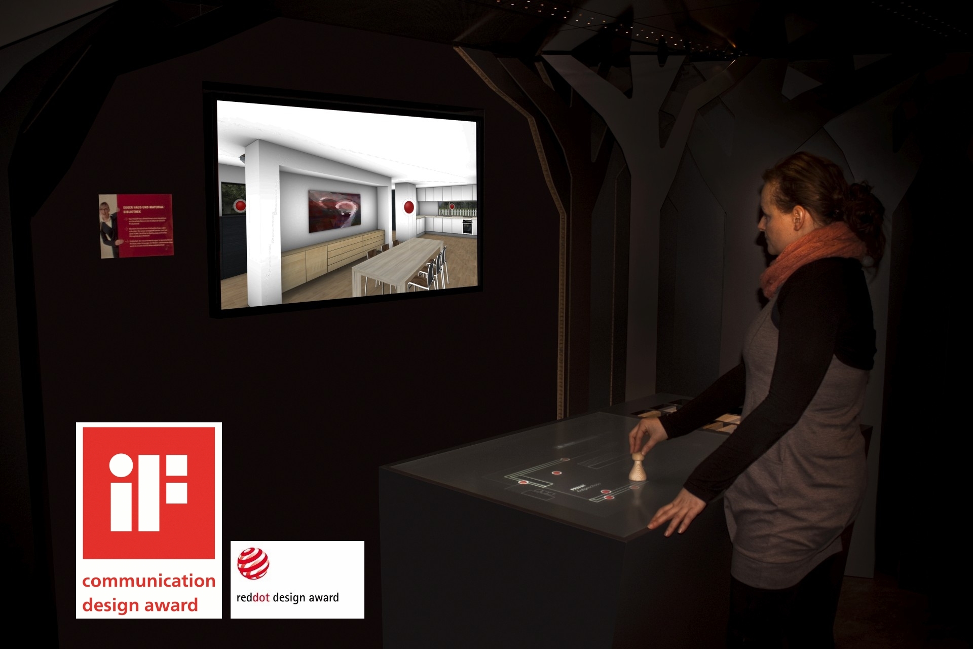 At this point edddison with its self-developed interactive device, again comes into operation. With an application, which was especially tailor made for the particular requirements of Egger Wood, the system becomes an interactive library of materials with practical and descriptive features. With the help of a virtual house the production engineer, architect, carpenter or interior decorator can now test the suitability of each material for the desired purpose. Thus the impact of a material-change on constructional and/ or optical issues can directly be experienced in a 3D presentation of the house in real-time.