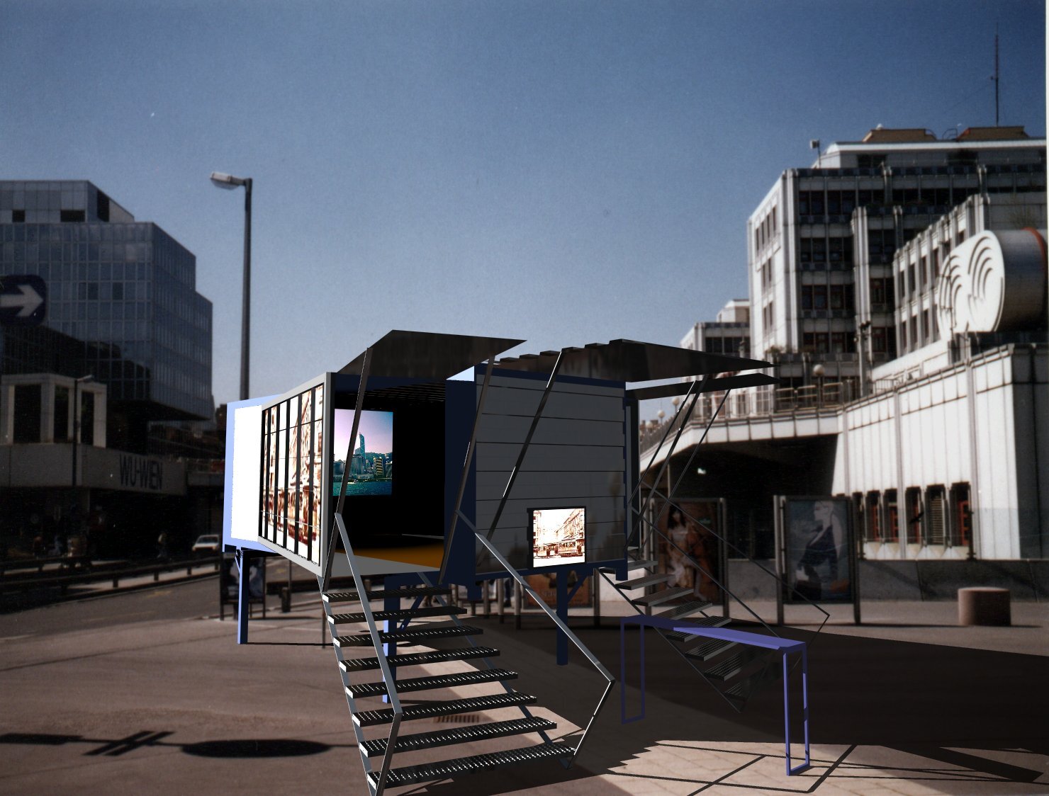 Concept mobile exhibition Container: After being parked by the truck, the container unfolds and expands by means of elements that can be folded out to the side. visitors have two staircases at their disposal, one for entering and one for exiting the exhibition, thus enabling the exhibition to run smoothly. The outside of the folding elements are designed as a kind of information wall, they accommodate posters, writings, and monitors. The exhibition object meets the high design standards set for the project through the sophisticated mechanics, selected materials and additional elements.