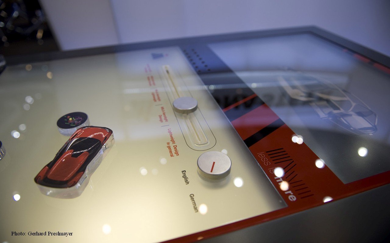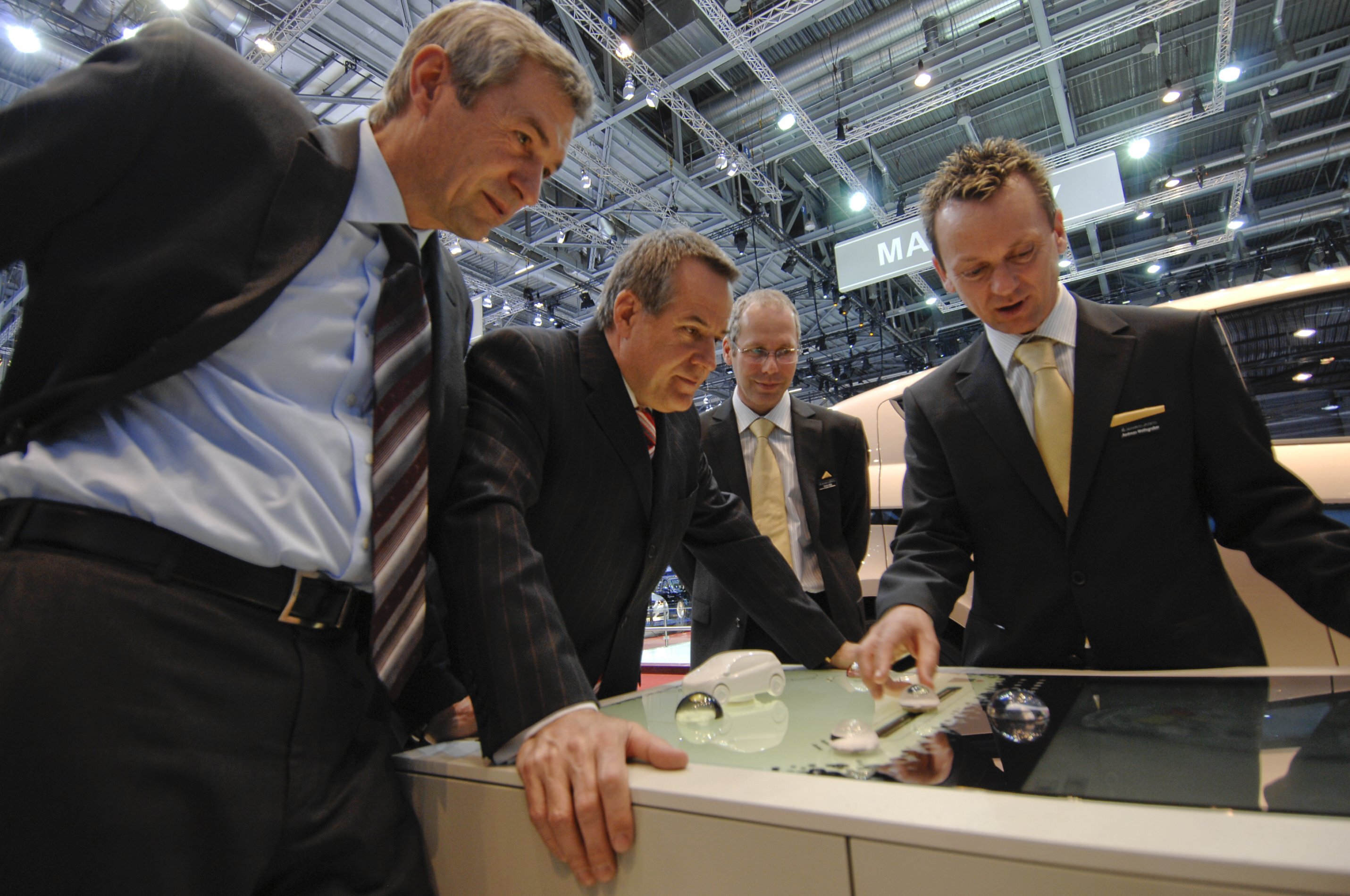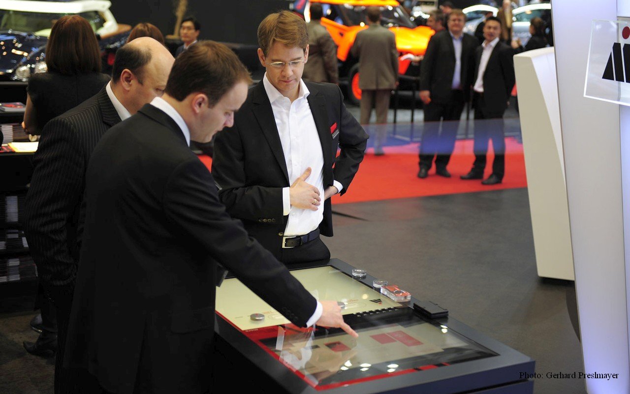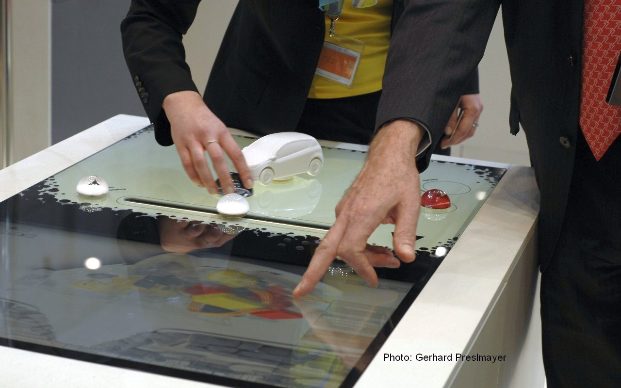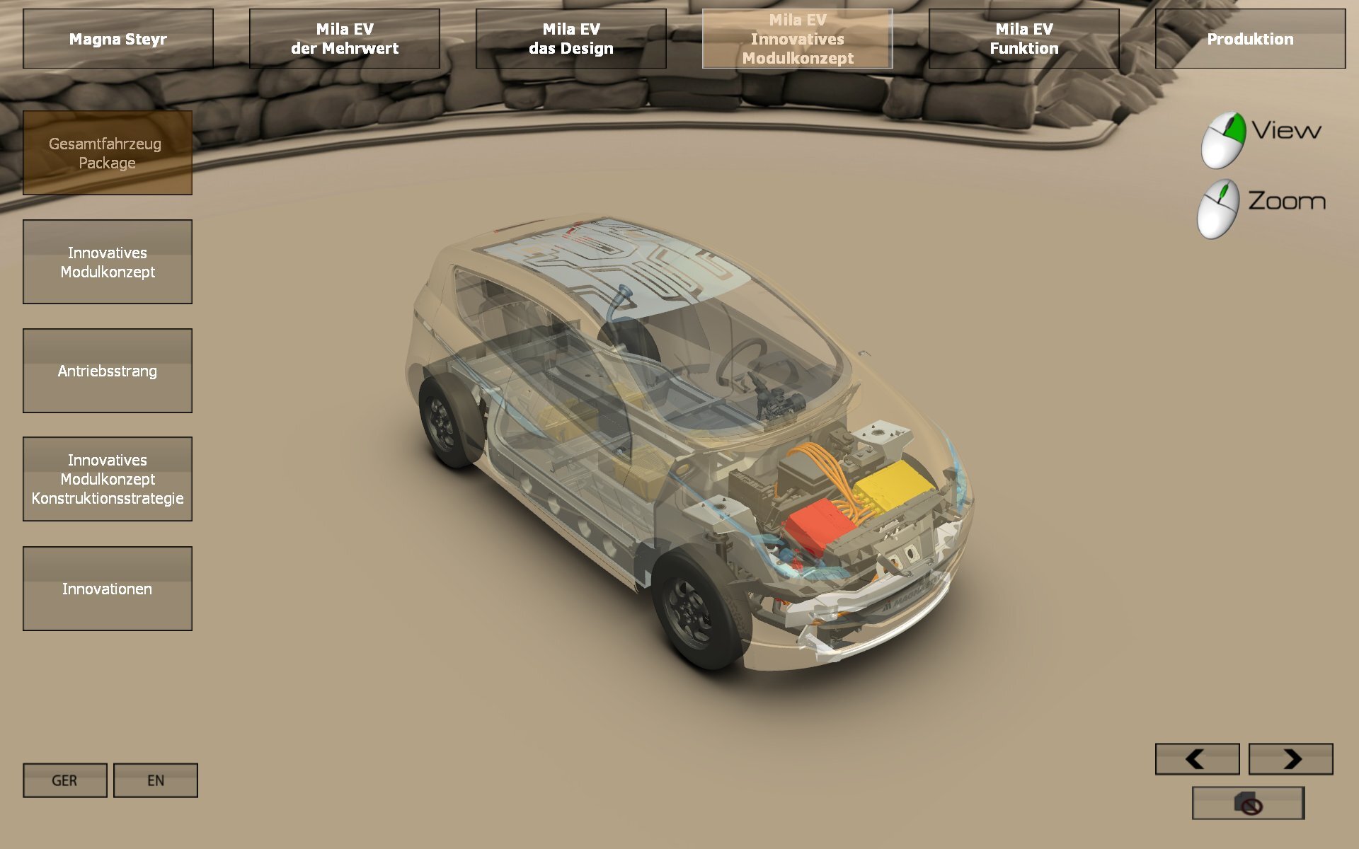 The marketing team of Magna Steyr Fahrzeugtechnik and Magna Powertrain in Graz and Detroit uses the edddison technology at tech shows and trade fairs. All 3D data from Magna's Mila Alpin 2008, Mila EV 2009 and Mila EV 2011 prototypes were incorporated into a real-time environment. In this way, trade show visitors can explore the virtual vehicle themselves without any effort by simply moving figures and models around the table.