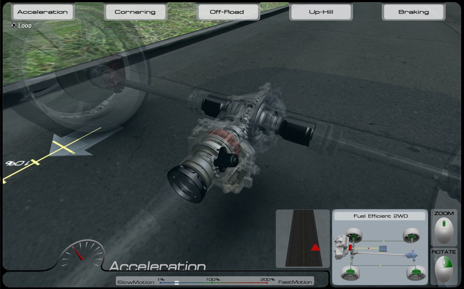 The realtime 3D Application shows a "simulation" of the "pro active coupling" developed by Magna Powertrain. The coupling equates different coefficients of road friction and surfaces like asphalt, ballast, cornering and gradients. The torque distribution in different driving situations like uphill, cornering and breaking is illustrated by arrows in the application. Longer arrow – higher torque , Shorter arrow – lower torque. To visualize these coupling attributes we build this setup together with KOOP and Stage Partner. The arrows in the application corresponds with the LED stripes in the real model and show how the coupling works. In addition motors are driving the real wheels simultaneously to the movements in the realtime 3D application.