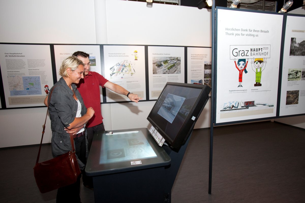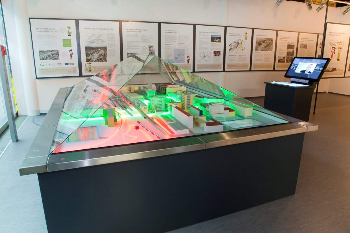The central railway station in Graz is, with a daily customer frequency of about 30.000 railway customers, one of the most important traffic junctions in Austria. Besides a further frequency improvement, its national and international importance will also continue rising with the completion of the Koralm-track in 2026. How can the necessary assimilations be displayed to the citizens of Graz and the visitors of the railway station? In The ÖBB Infobox at the central railway station Graz. The interested public is able to inform itself about the building project “Central Railway Station Graz 2020”. With the help of numerous renderings, interactive edddison installation, around a huge architecture-model, the project is presented.
