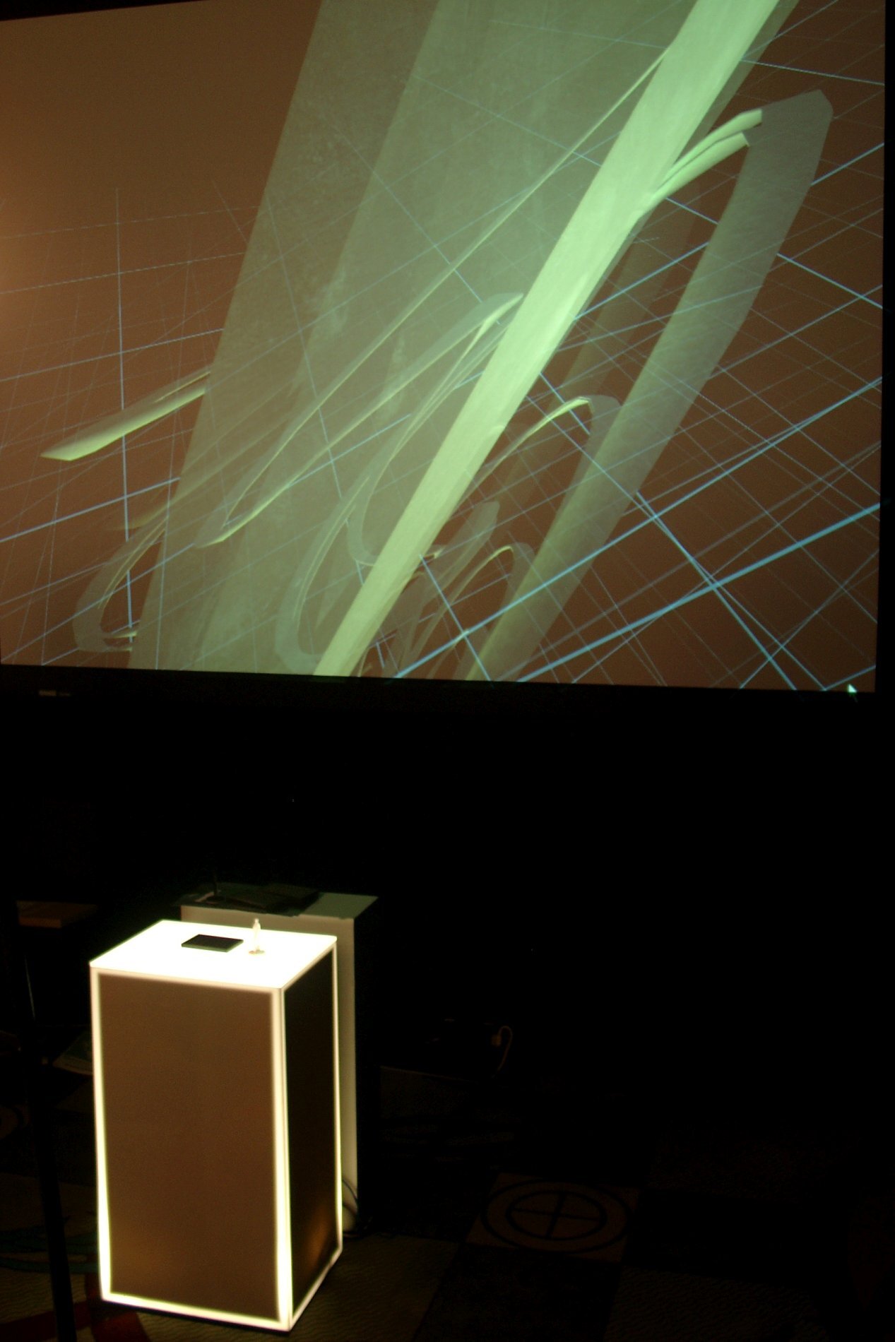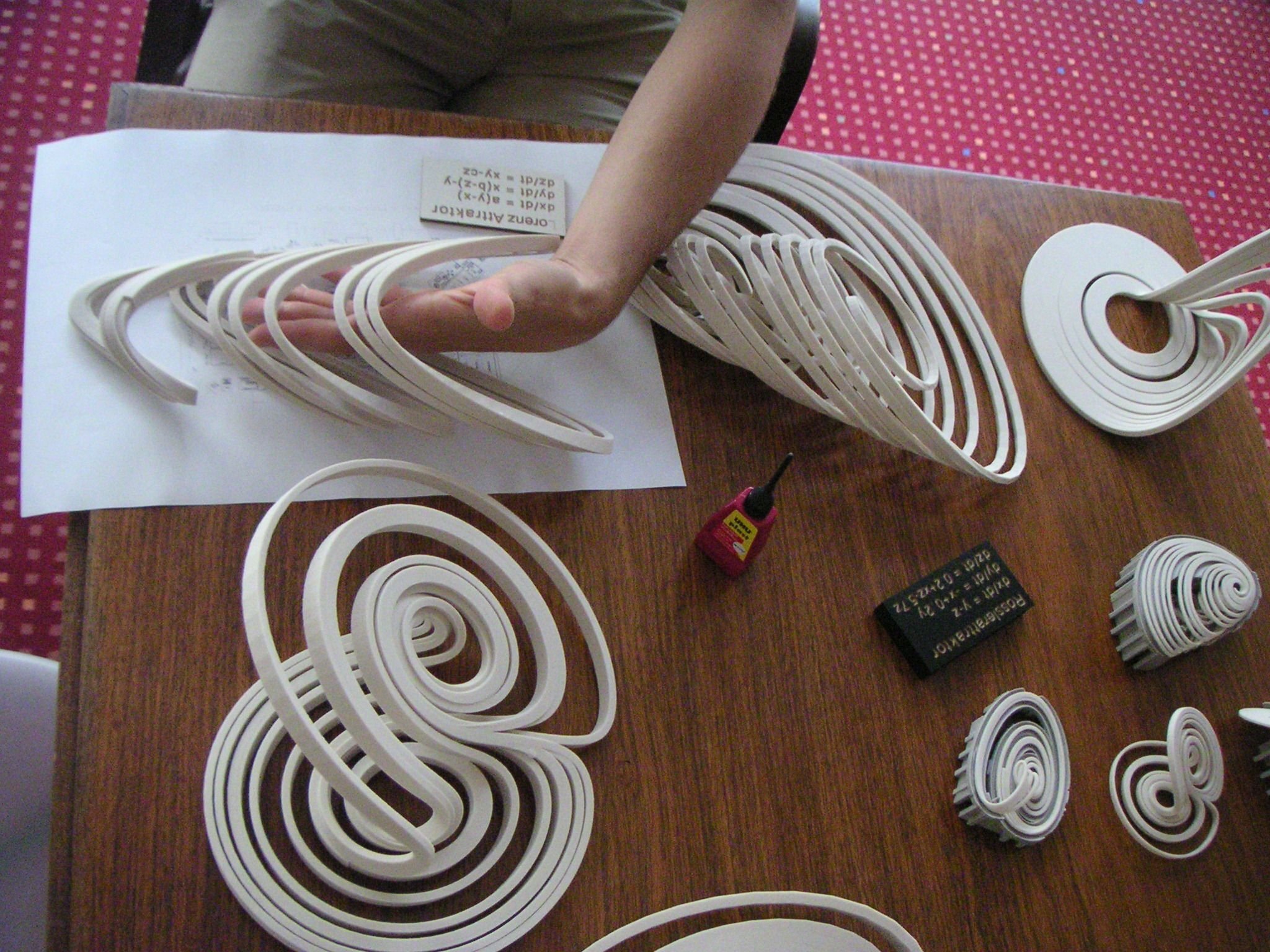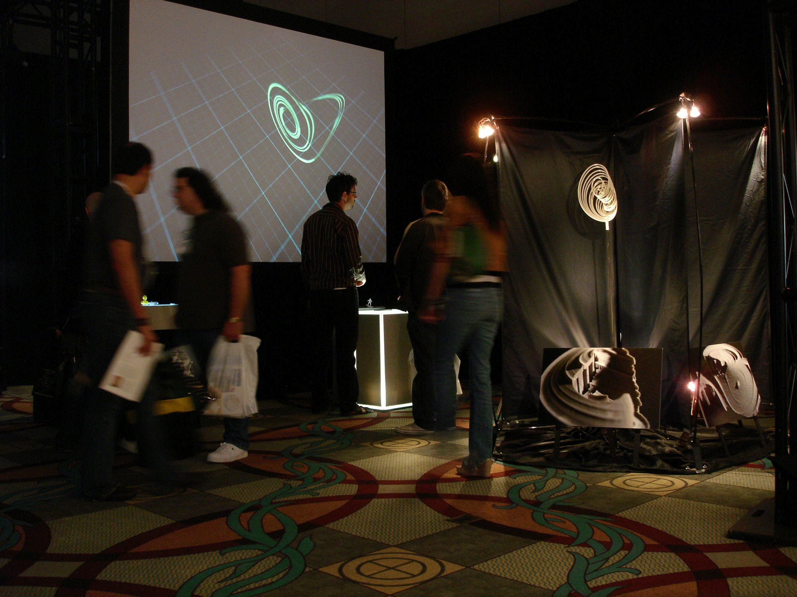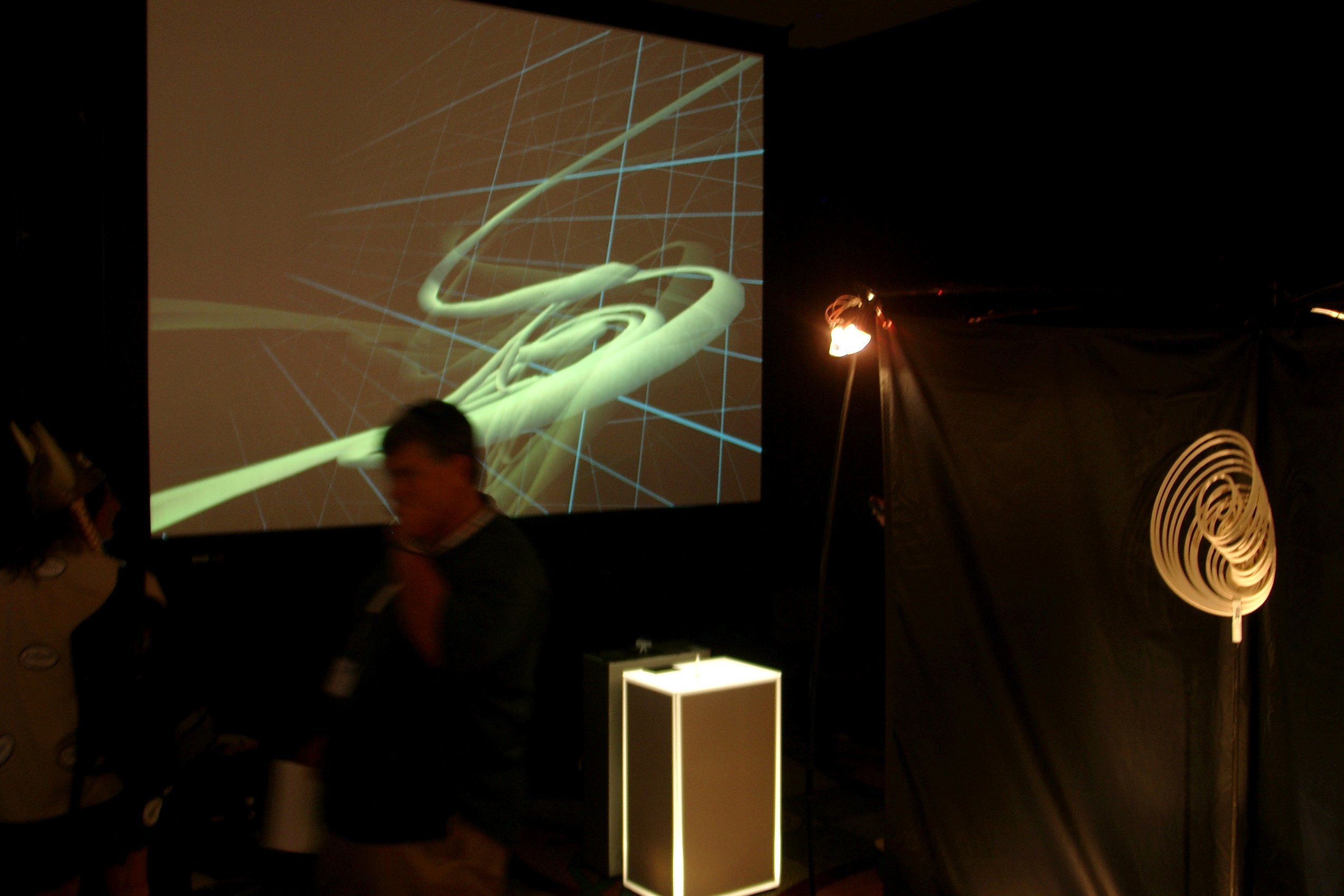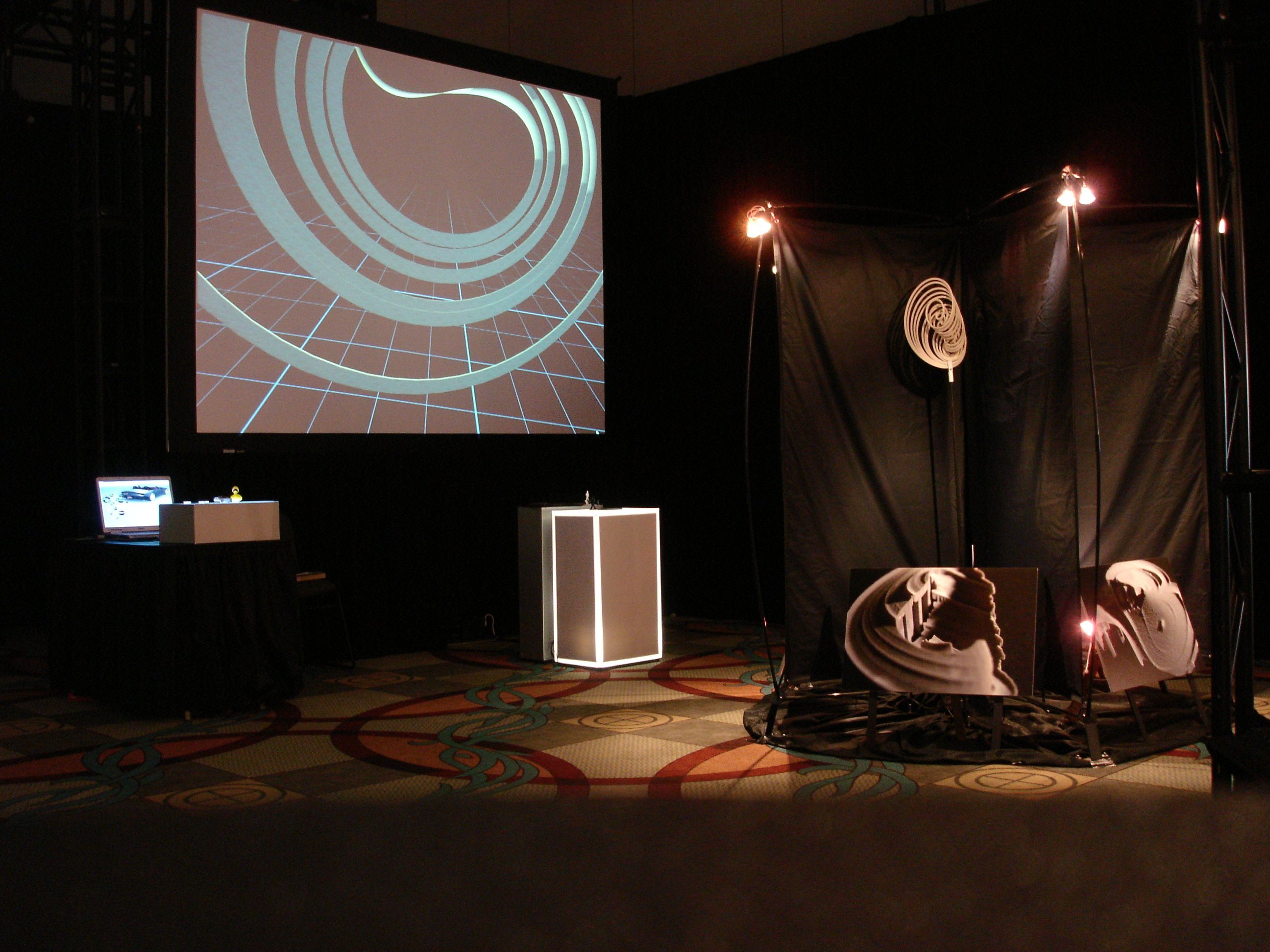 _zur form (_on form) is a collaborative mixed-reality installation by Florian Grond, Thomas Kienzl and Gabriele Engelhardt. In it, mathematical formulas are transformed into 3D forms and are presented as sculptures together with a tangible mixed reality installation. The project also features photographs of the support forms, the negative casts that emerge out of the form production process. _zur form makes a contemporary contribution to the well-established tradition of representing mathematical functions as 3D forms, which dates back to 19th-century Germany. The early forms inspired a number of artists in the 19th and 20th centuries, and also became the point of departure for the conception of our project. In German, the word "begreifen" (to understand) literally means to grasp an idea, as with a hand. The transformation of formulas into forms also emphasizes the original meaning of the word "information," which is "bringing into form." Thus, by making tangible objects out of abstract mathematical concepts, the sculptures and their representations underline both the material and physiological aspects that pertain to the construction and accessibility of knowledge.