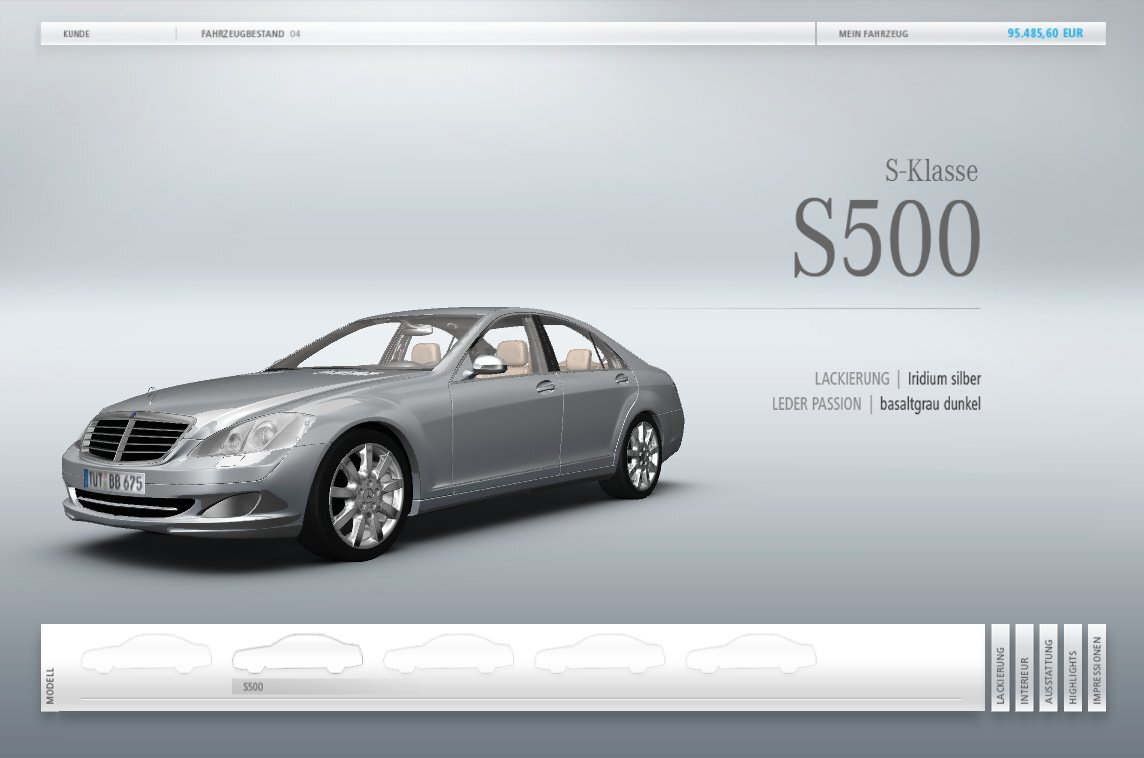 Since decades the Mercedes-Benz S-Class is measure of automotive innovation and exalted driving culture. This exclusiveness shall also be expressed trough the presentation of the latest models. How can we impress our customers – not only with what we are presenting, but also with the way we are doing this? Together with The Mercedes Marketing-Department, we developed an exclusive installation, on which sophisticated Mercedes-fancier are able to closely experience the latest S-Class models. The realistic depiction of the automobile, virtually allows the prospective customer to take a seat in the new vehicle. Color, seat cover and many other features can be changed in one second – the customer playfully creates his own model regarding his wishes and preferences.